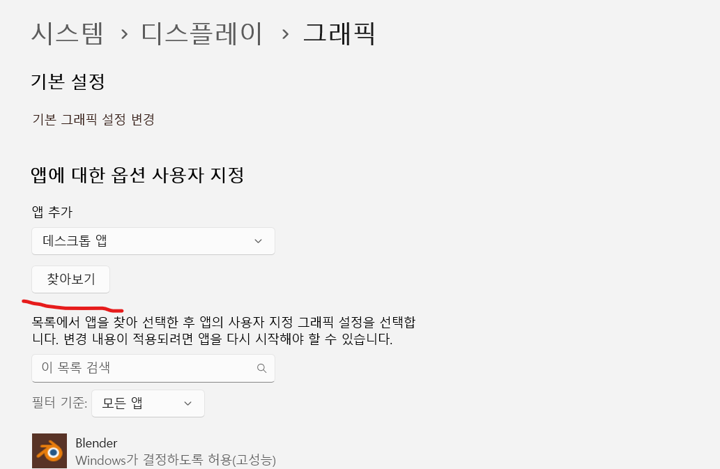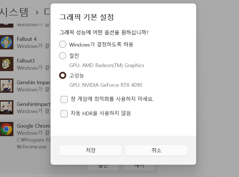 윈도우 설정(톱니아이콘) -> 시스템 -> 디스플레이(중단쯤에)-> 그래픽->