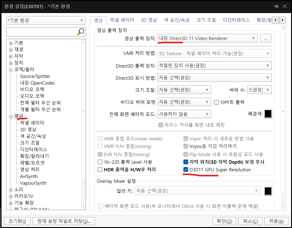 영상 출력 장치를 내장 Direct3D 11 Video Renderer로 변경