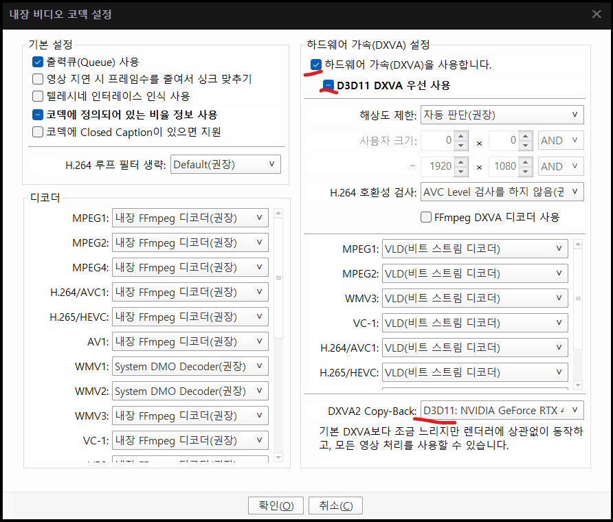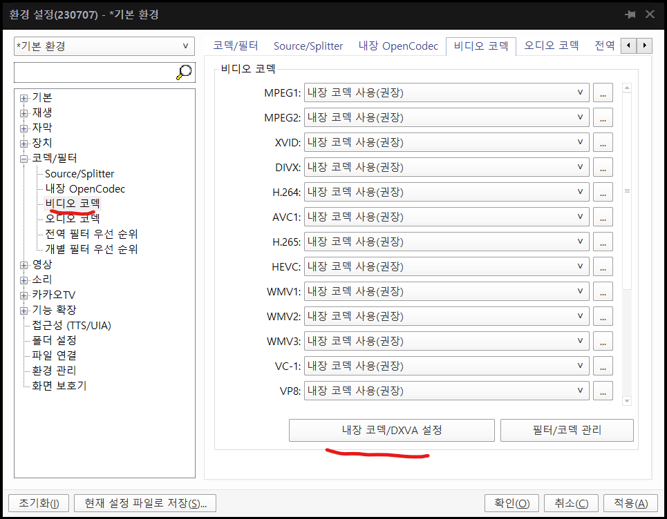 코덱/필터->비디오 코덱->내장 코덱/DXVA 설정